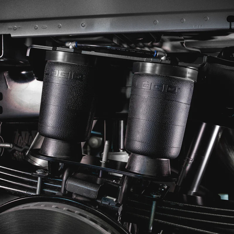 Mientras que la mayoría de las soluciones de fábrica y de posventa compensan las cargas pesadas simplemente aumentando la resistencia del muelle o añadiendo más paquetes de ballestas, LOGIQ soluciona la nivelación de carga utilizando pulmones neumáticos de doble manguito rodante, ajustados para adaptarse a la frecuencia de conducción de la suspensión delantera, lo que garantiza la conducción más suave posible en estas camionetas. Ya sea que remolques cargas pesadas a diario o que solo uses el remolque de vez en cuando, LOGIQ mejorará drásticamente tu experiencia.