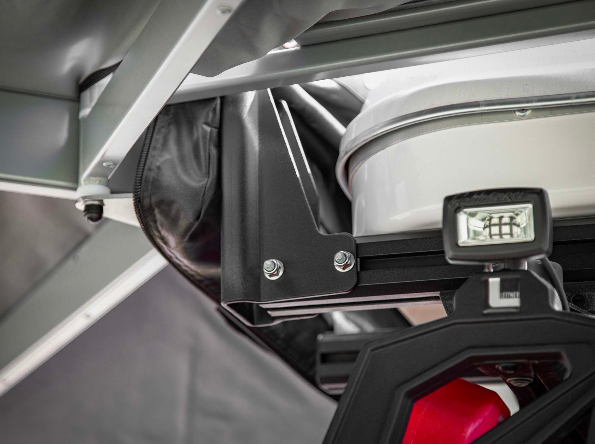 El soporte para toldo HD está diseñado y fabricado en el sur de California con el mismo acabado de pintura en polvo automotriz de dos etapas que los Rack Leitner ACS.